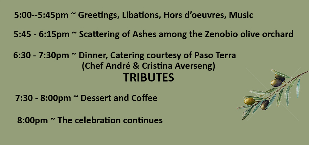 Paso Terra, and supported Laurie's spirited work with Wine Country Theatre. He also leaves behind his mother and sister, three nieces and three nephews, extended family in Italy, California, and on the East Coast. He is missed by dozens of friends, many of whom he had known since childhood, who enjoyed a game of golf, and the bounty of the Zenobio summer crops as guests at the